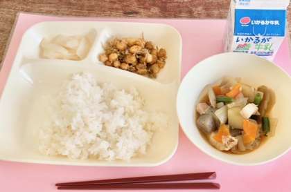 【ごはん、鶏肉と野菜の煮もの、じゃこ豆、かぶのゆず風味、牛乳】