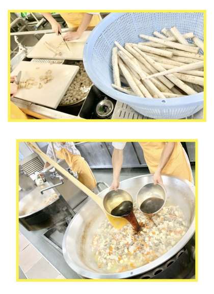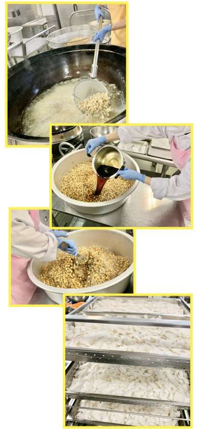 じゃこ豆は、ゆでたちりめんじゃこと、でんぷんをまぶしてなたね油であげた大豆に、甘辛い調味液をからませたかみごたえのある献立です。子どもたちにも教職員にも人気です。(写真4〜6枚目)