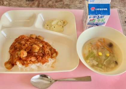 【ケチャップライス、スープ、じゃがいものバジル焼き、牛乳】