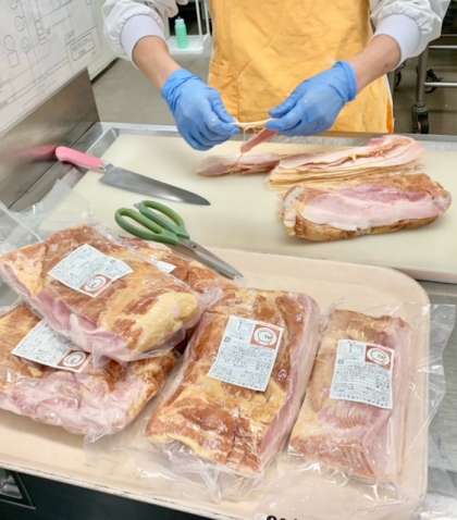 ケチャップライスは、ウインナー、ベーコン(写真2枚目)、たまねぎ、ピーマンをいため、ケチャップ、ウスターソース、カレー粉などで味つけした具をごはんにかけ、混ぜ合わせていただきます。給食初登場の献立でした。