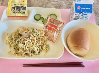 【黒糖パン1/2、和風焼きそば、きゅうりのしょうがづけ、いり黒豆、牛乳】