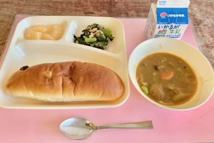 【レーズンパン、ミートボールと野菜のカレー煮、ツナとこまつなのソテー、白桃(カット缶)、牛乳】