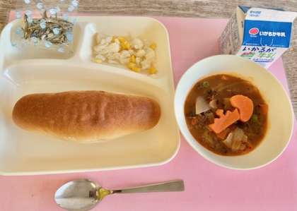 【黒糖パン、ビーフシチュー、カリフラワーとコーンのサラダ、ミニフィッシュ、牛乳】