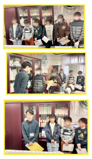 給食週間が始まりました。給食週間とは、学校給食の意義や役割について、子どもたちの理解と関心を高めるための週間です。給食委員会の子どもたちが話し合い、新高小学校の代表として給食調理員さんへの感謝状をつくり、全校朝会で渡しました。