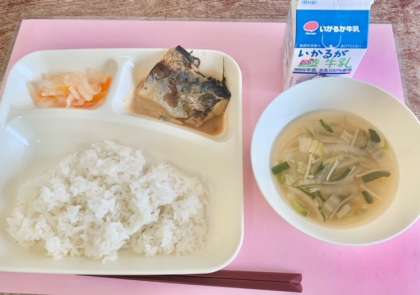【ごはん、さばのみそ煮、すまし汁、紅白なます、牛乳】