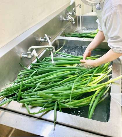 すまし汁は、はくさい、たまねぎ、えのきたけ、青みに青ねぎ(写真2枚目)を使った汁ものです。
