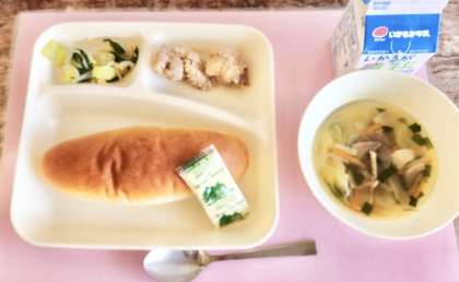 【コッペパン、ソフトマーガリン、鶏肉のからあげ、中華スープ、チンゲンサイともやしの甘酢あえ、牛乳】