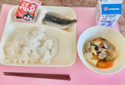 節分の日には、病気や悪い出来事を追い払うため、「鬼は外、福は内」と言って豆まきをしたり、年の数だけいり大豆を食べたりする風習があります。また、鬼が嫌がるいわしの頭を玄関に飾ったり、いわしを食べたりする風習もあるため、今日の給食では、いわしといり大豆を使っています。