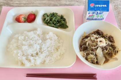 【ごはん、すき焼き煮、さんどまめのごまあえ、いちご、牛乳】