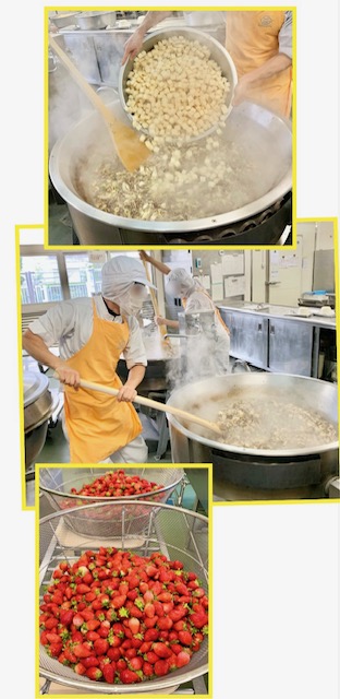 すき焼き煮は、子どもたちに人気の献立です。牛肉を主材に、糸こんにゃく、とうふ、旬のはくさい、白ねぎ、まいたけを使用しています。(写真2、3枚目)