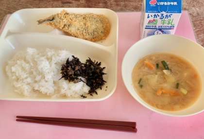 【ごはん、いわしフライ、みそ汁、牛ひじきそぼろ、牛乳】