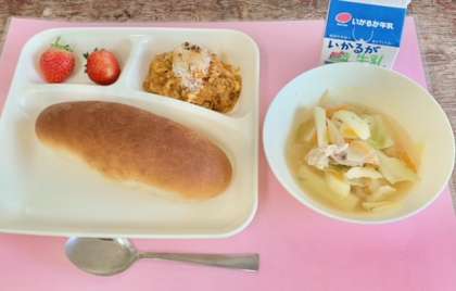 【黒糖パン、とうふのミートグラタン、じゃがいもと野菜のスープ、いちご、牛乳】