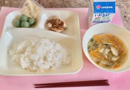 【ごはん、鶏肉のみそバターソース、五目汁、きな粉よもぎだんご、牛乳】