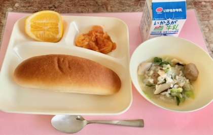 【黒糖パン、えびのチリソースいため、中華がゆ、はっさく、牛乳】