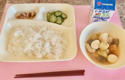 【ごはん、関東煮、きゅうりの梅風味、とら豆の煮もの、牛乳】