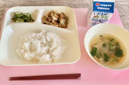 【ごはん、ホイコウロー、中華スープ、きゅうりのピリ辛あえ、牛乳】