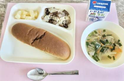 【黒糖パン、金時豆の中華おこわ、中華スープ、パインアップル(カット缶)、牛乳】