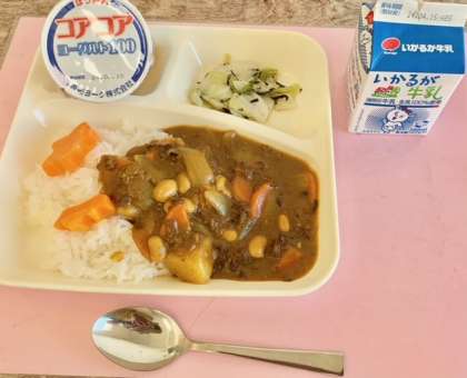 【牛肉と大豆のカレーライス、キャベツのひじきドレッシング、ヨーグルト、牛乳】