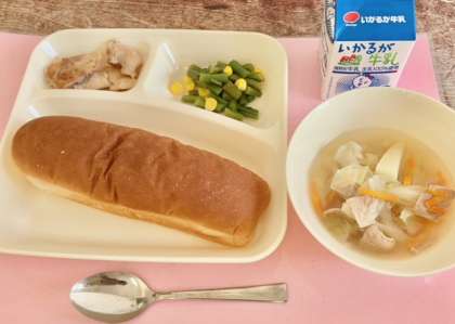 【黒糖パン、鶏肉のガーリック焼き、スープ、さんどまめとコーンのサラダ、牛乳】