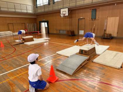 今日はスポーツ講師の先生方に、跳び箱の授業をしていただきました。跳び箱を上手く跳ぶために、踏み切るタイミングや姿勢などを教わりました。子ども達もいつも以上に真剣な様子です。終わった後には「もうちょっとで跳べそう!」「うまくできた!」という声も聞こえてきました。跳び箱の苦手な子ども達も楽しんで学ぶことができていました。