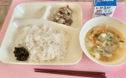 【ごはん、豚肉の梅風味焼き、五目汁、のりのつくだ煮、牛乳】