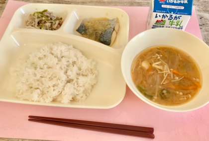 【ごはん、さごしのおろしじょうゆかけ、みそ汁、野菜いため、牛乳】