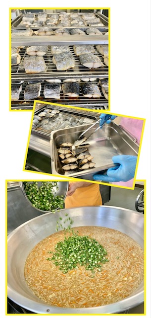 みそ汁は、とうふ、たまねぎ、えのきたけ、青みにオクラを使用しています。(写真4枚目)