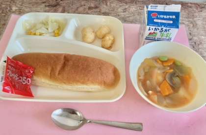 【コッペパン、いちごジャム、いかてんぷら、フレッシュトマトのスープ煮、キャベツとコーンのサラダ、牛乳】