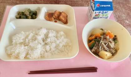 【ごはん、肉じゃが、あつあげのみそだれかけ、オクラのおかかいため、牛乳】