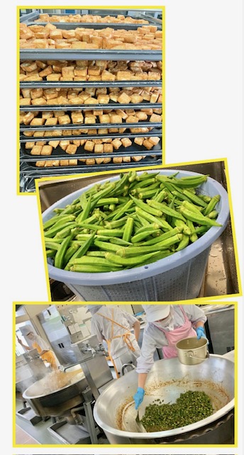 オクラのおかかいためは、オクラをいため、みりん、こいくちしょうゆ、かつおぶしで味つけしています。(写真3、4枚目)