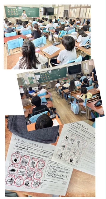 4年生は食に関する指導で、おやつについて考えました。おやつの本来の意味を知り、200キロカロリーをめやすにおやつを選ぶことや、そのためにできる工夫について考えたり、話し合ったりしました。