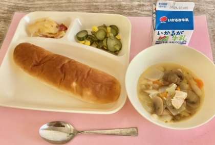 【おさつパン、鶏肉とてぼ豆のスープ煮、ベーコンとじゃがいものチーズ焼き、きゅうりとコーンのサラダ、牛乳】