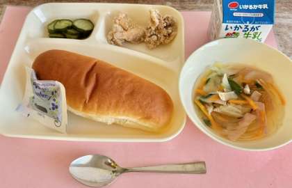 【コッペパン、ブルーベリージャム、鶏肉のからあげ、ハムとはるさめのスープ、きゅうりの中華あえ、牛乳】