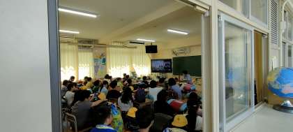 初めに校長先生の話があり、その後夏休みの生活について生活指導担当より話があり、最後にみんなで校歌を歌いました。