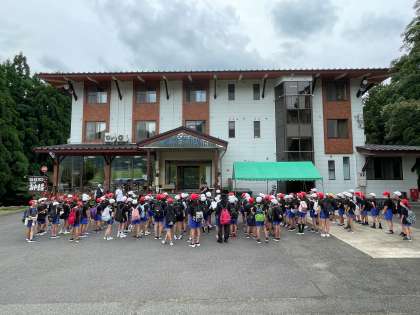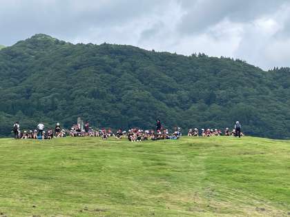 緊急時の避難ルートを確認した後、ハチ高原の草原にてお弁当を食べています。