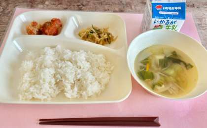 【ごはん、ヤンニョムチキン、とうふのスープ、切干しだいこんのナムル、牛乳】