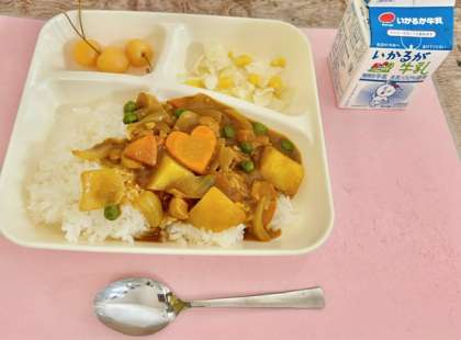 【チキンカレーライス、キャベツとコーンのサラダ、さくらんぼ(缶)、牛乳】