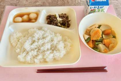 【ごはん、一口がんもとさといものみそ煮、牛肉と野菜のいためもの、みたらしだんご、牛乳】