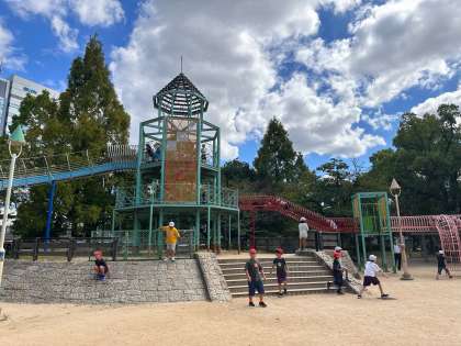 みんなでお弁当とおやつをお腹いっぱい食べてからは、遊具のある公園で元気よく遊んでいました。