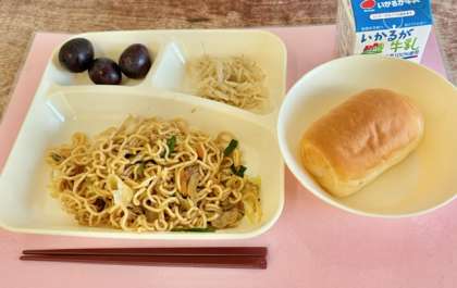 【ミニコッペパン、オイスターソース焼きそば、もやしのしょうがづけ、ぶどう(巨峰)、牛乳】