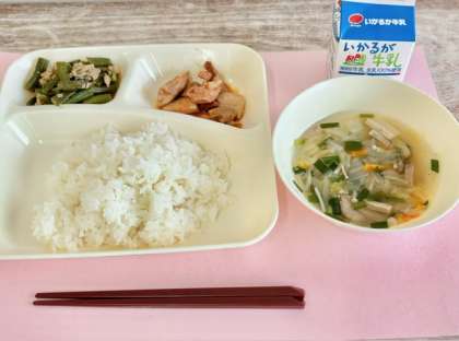 【ごはん、鶏肉のチリソース焼き、焼き豚のスープ、ツナとさんどまめのオイスターソースいため、牛乳】