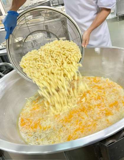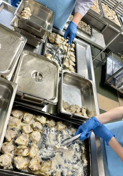 かつおのガーリックマリネ焼きは、にんにく、塩、白こしょう、ノンエッグドレッシングで下味をつけたかつおを焼き物機で焼いています。(写真1枚目)