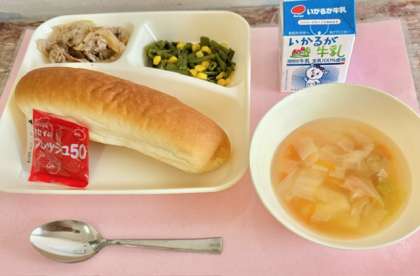 【コッペパン、いちごジャム、豚肉のガーリック焼き、鶏肉と野菜のスープ、さんどまめとコーンのソテー、牛乳】