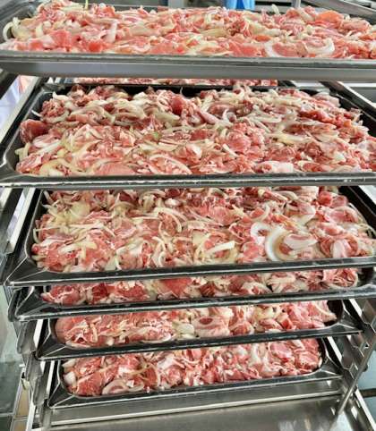 豚肉のガーリック焼きは、豚肉にワイン、塩、粗挽きこしょう、ガーリック、こいくちしょうゆ、オリーブ油で下味をつけ、たまねぎを混ぜ合わせ、焼き物機で焼いています。(写真2枚目)