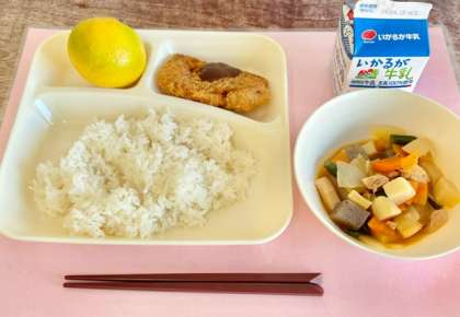 【ごはん、みそカツ、じゃがいもと野菜の煮もの、みかん、牛乳】