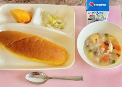 【パンプキンパン、鶏肉とさつまいものシチュー、はくさいのピクルス、かき(平核無柿)、牛乳】