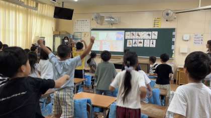 高学年の指導をしてくださっているニコル先生の授業を1年生が受けました。