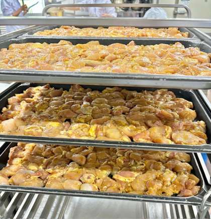 鶏肉のカレー風味焼きは、鶏肉に塩、粗挽こしょう、ガーリック、カレー粉、綿実油で下味をつけ、焼き物機で焼いています。(写真2枚目)