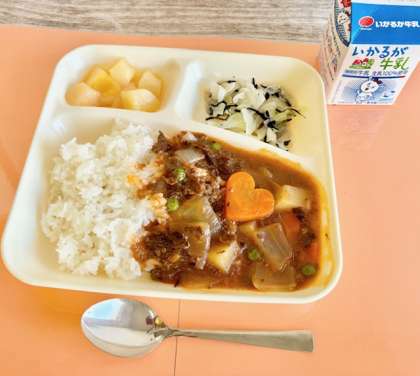 【ハヤシライス、キャベツのひじきドレッシング、白桃(カット缶)、牛乳】
