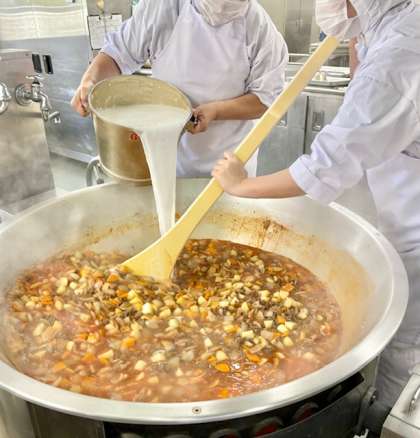 ハヤシライスは、牛肉、じゃがいも、たまねぎなどの具材をトマトピューレ、ケチャップと煮て、トンカツソース、ウスターソースなどで味つけして煮込んでいます。とろみは上新粉(うるち米の粉)でつけています。(写真2枚目)